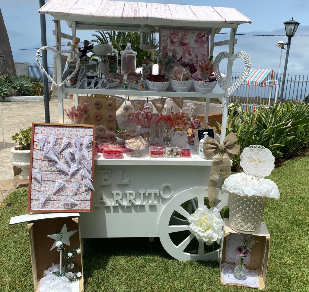 Alquiler de hermoso y elegante carrito de dulces para eventos, en medida de un metro de ancho y 1,80 metros de alto. Costo de alquiler 95 euros. Estimado cliente el costo del alquiler no incluye el traslado, el traslado se cobra dependiendo de la distancia.